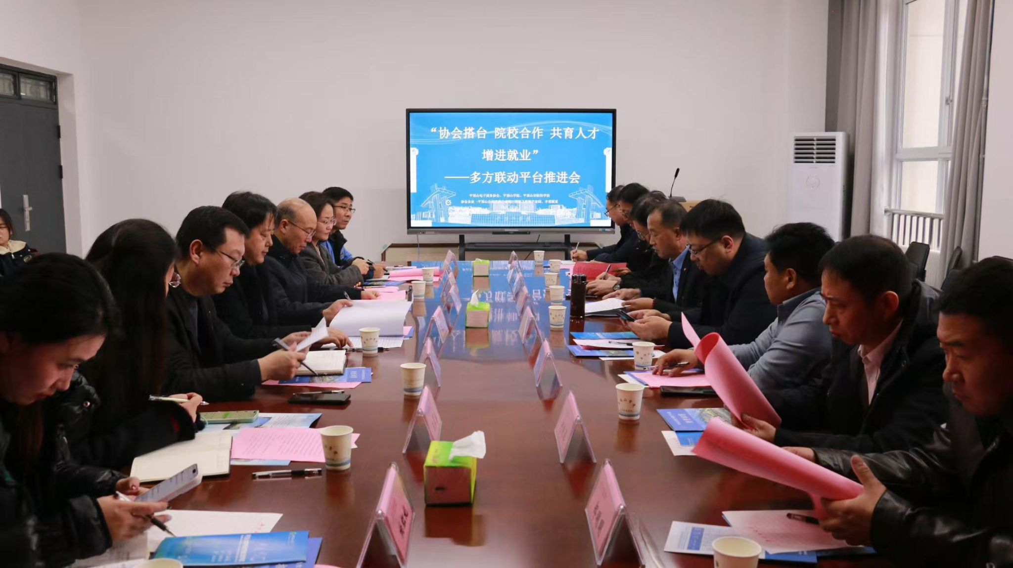 12 月 22 日下午,“协会搭台 院校合作 共育人才 增进就业” 多方联动平台推进会在知行楼 RB422 会议室召开。平顶山市财经学校党委书记周勃、平顶山市电子商务协会秘书长 姬国平、我校副校长李波及相关部门、学院负责人,企业代表及部分师生代表齐聚,共探“政会校企”协同育人新路径。会议由平顶山市电子商务协会秘书长姬国平主持。