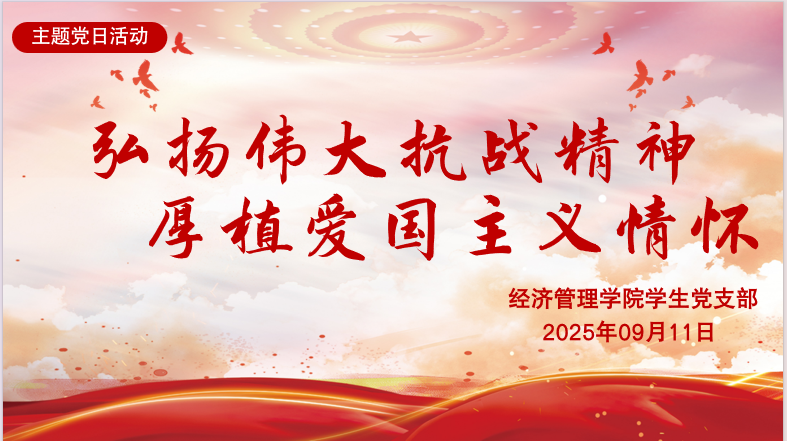 为纪念中国人民抗日战争暨世界反法西斯战争胜利 80 周年,厚植爱国情怀、传承红色基因,2025年9月11日下午,经济管理学院学生第一党支部与学生第二党支部同步开展“弘扬伟大抗战精神,厚植爱国主义情怀”主题党日活动,学院 90 余名学生党员参加。